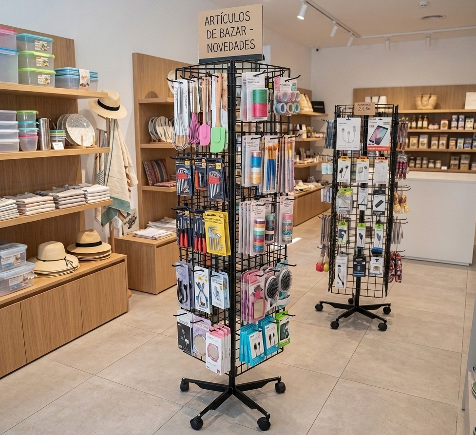El expositor de malla ha sido proyectado para ofrecer una superficie de carga polivalente y resistente ante el uso intensivo. Gracias a su diseño en torre de cuatro lados, permite segmentar diferentes categorías de artículos en un solo mueble, facilitando que el usuario encuentre lo que busca de forma rápida. Su fabricación en varilla o chapa de acero garantiza que la cuadrícula mantenga su geometría original, soportando el peso de múltiples referencias sin comprometer la estabilidad.