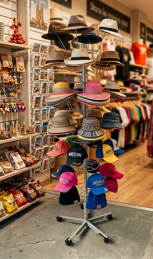 El expositor de sombreros es la herramienta ideal para tiendas de moda, complementos y souvenirs. Su diseño vertical con niveles giratorios independientes permite una visualización perfecta de cada pieza, facilitando la elección del cliente.