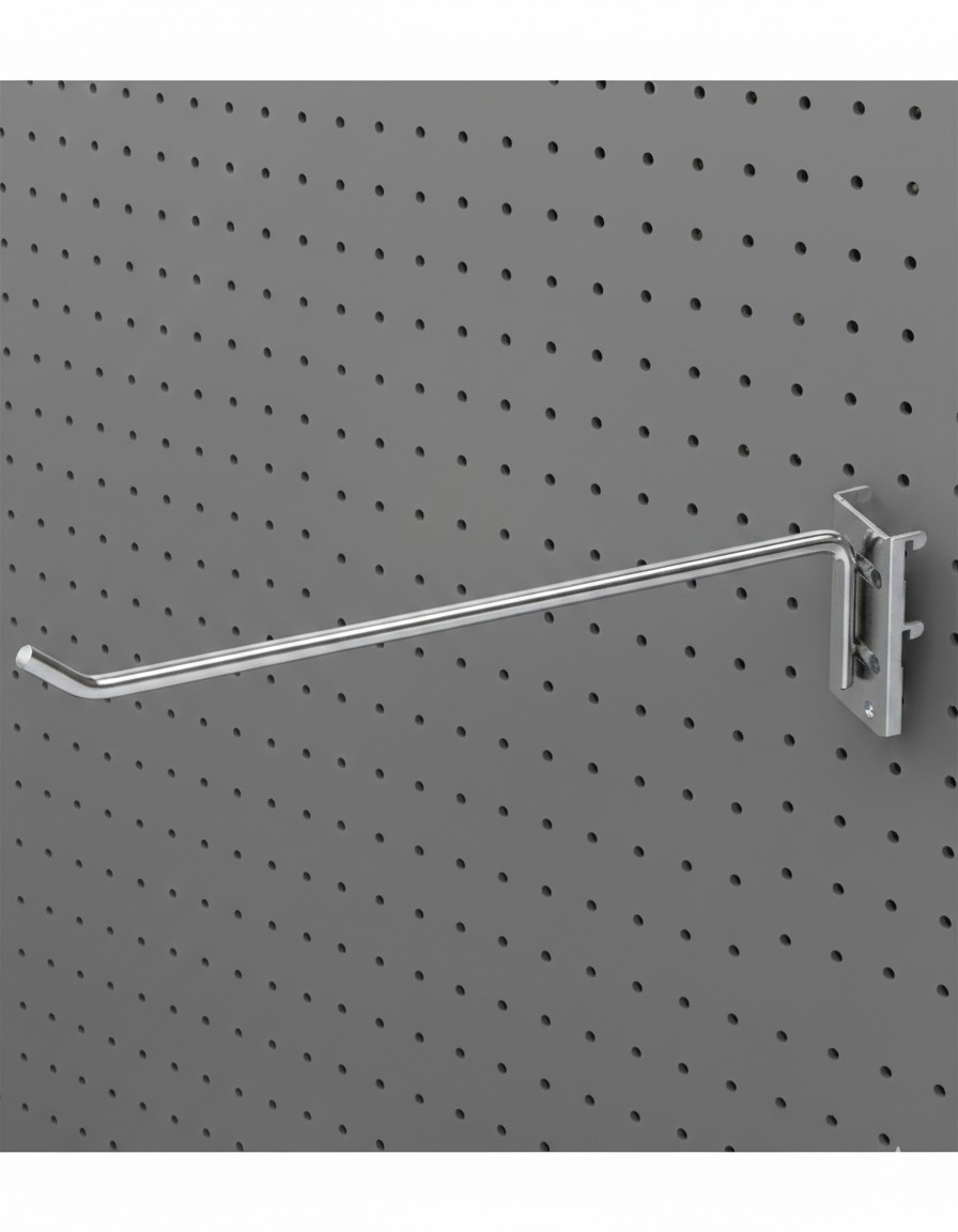 Optimice la organización de su punto de venta con este gancho de alta resistencia. Diseñado específicamente para encajar en paneles de chapa perforada, su sistema de sujeción mediante chapa garantiza una estabilidad superior y evita movimientos no deseados.
