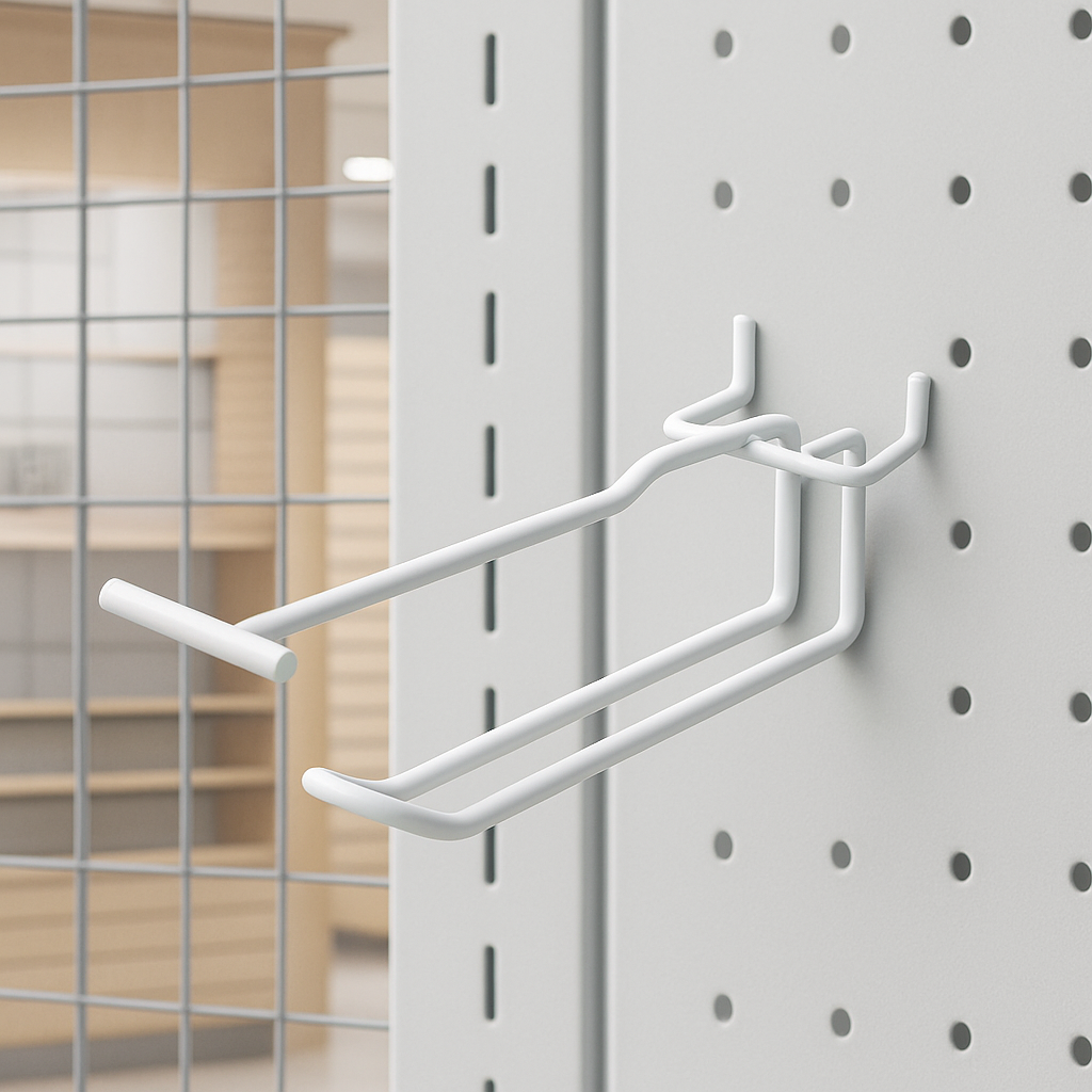 Soportes metálicos para colgar productos en blister en paneles de tienda.